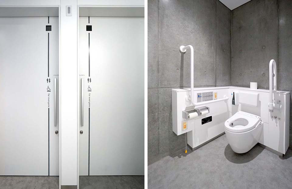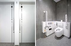 「日本体育大学」では、横浜・健志台キャンパスの老朽化した既存施設の順次建替えを予定。第一弾として新5号館を建設した。トイレは、体育大学として求められる仕様・設備を充実。さらに、ダイバーシティ検討プロジェクト委員会からの要望を受けて、設置場所にも配慮した男女共用トイレが設けられている。