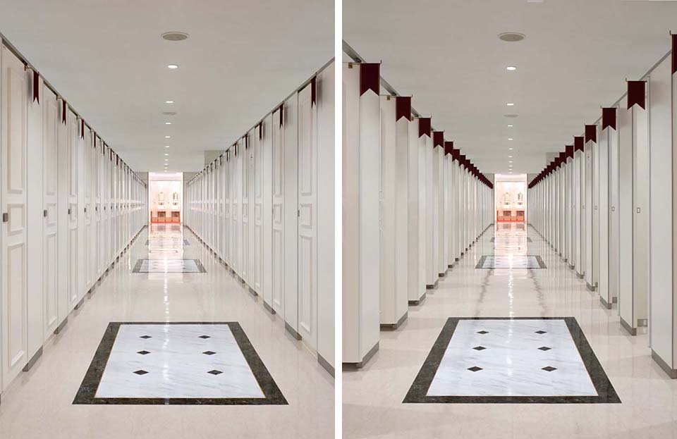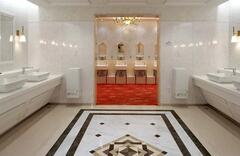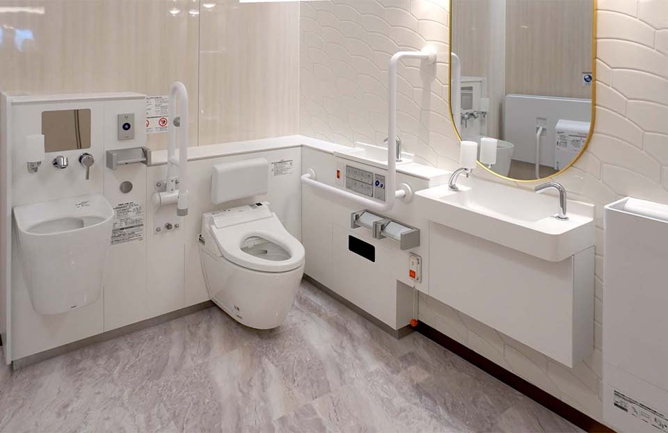 今回の改修工事では、宝塚歌劇らしさを感じられる空間づくりと混雑緩和を両立させたトイレの整備が目指された。館内全体でのトイレ配置を見直し、幕間など混雑時もスムーズに利用できるよう動線を最適化した。劇場改札内1Fトイレでは中世ヨーロッパ風の意匠を継承、ブース扉の開閉サインに光沢ある旗を採用するなど細部まで宝塚歌劇の世界観を演出している。ショップ&レストランゾーンのトイレは、スペースを拡張。前室通路の設置や出入口の一方通行化により待機列の解消を図った。器具は、非接触で洗浄でき掃除口付きの大便器、ベッセル式や壁掛式の洗面器を採用。車いす使用者やオストメイトに対応できる男女共用多機能トイレを整備するなど、だれもが安心して利用できる配慮を行き届かせた。